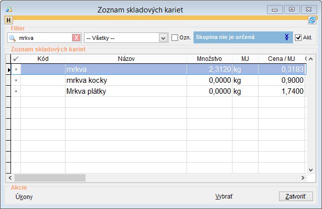 Zoznam skladových pohybov na skladovej karte Mrkva.