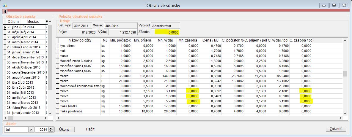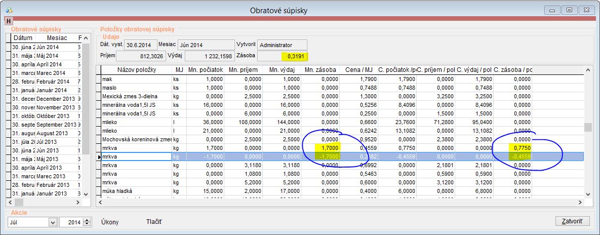 Vytvorili sme obratovú súpisku za mesiac Jún, na ktorej nám nesedí stav na skladovej karte "Mrkva". Táto nám na súpiske figuruje s kladnou aj zápornou hodnotou v celkovej cene zásoby. Keď si však v zozname skladových kariet túto surovinu nájdeme zistíme, že množstvo na skladovej karte je nulové. Prečo teda k tomuto rozdielu došlo? Pravdepodobne k tomuto došlo pri spätnej úpravy výdajky ale už nedošlo k prepočítaniu obratových súpisiek ani nasledovných stravných listov.