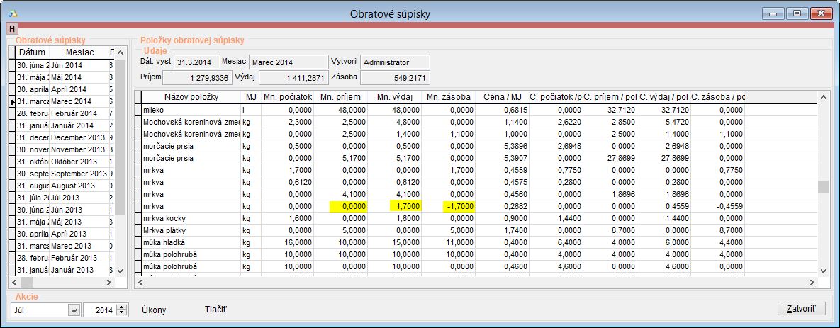 3. V našom konkrétnom prípade sme zistili, že prvý krát sa nám na výkaze takáto nezrovnalosť objavila v Marci. Na to, aby sme jednotlivé stravné listy vedeli skontrolovať a prípadné zmeny uložiť, musíme odstrániť vytvorené obratové súpisky. Pred odstránením obratových súpisiek si poznačte množstvo a cenu za ktorú bol tovar prijatý a vydaný aby ste tak presne vedeli dohladať v ktorej príjemke a výdajke bol tovar prijatý a vydaný. Bližšie informácie o pregenerovaní "Obratovej súpisky" sa dočítate v návode Nie je možné upraviť starší skladový doklad, tlačidlo "Uložiť" je zašednuté