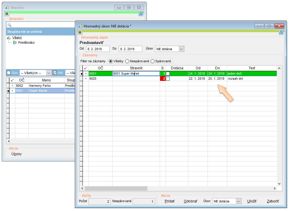 • Pri následnom importe a nastavení NIE dotácia je vybraným stravníkom zrušený nárok na dotáciu.