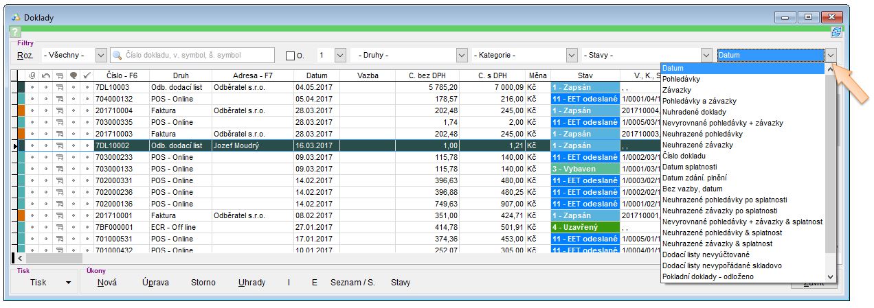 Filtr v seznamu dokladů