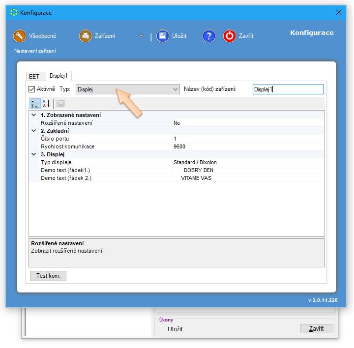 V případě, že definujete displej jen pro jedno zařízení, není potřebné v konfiguraci fiskálního zařízení definovat kód displeje na zařízení. Displej se k zařízení automaticky přiřadí. V případě, že je pro EET definováno více zařízení, je potřebné ke konkrétnímu zařízení nadefinovat kód displeje, nastavení Kód externího displeje.