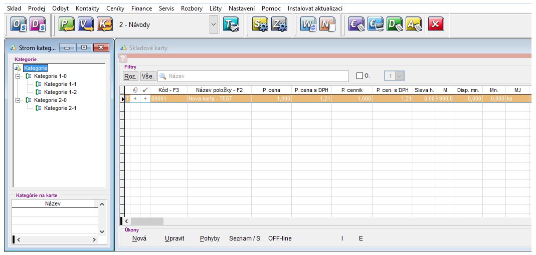 5. Následně se zobrazí v levé části obrazovky okno se seznamem skladových kategorií nadefinovaných v aplikaci. (Podle potřeby je možné si okno s kategoriemi nebo seznamem karet roztáhnout, případně posunout tak, aby byla okna v seznamu u sebe.)