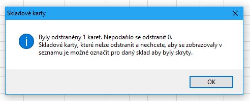 Pokud se Vám skladovou kartu nepodařilo vymazat, pravděpodobně už na dané skladové kartě existuje vazba na doklad. V tomto případě můžete dané skladové kartě nastavit tzv. "Zákaz prodeje". Více informací o této možnosti se dočtete v návodu Nastavení příznaku "Zákaz prodeje" na skladové kartě, případně můžete skladové karty i skrýt pro daný sklad. Více o této možnosti se dočtete v návodu Skrytí karet ve vybraném skladu.