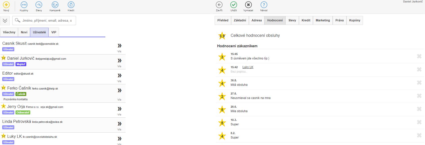 Hodnocení obsluhy v seznamu uživatelů