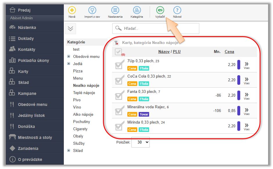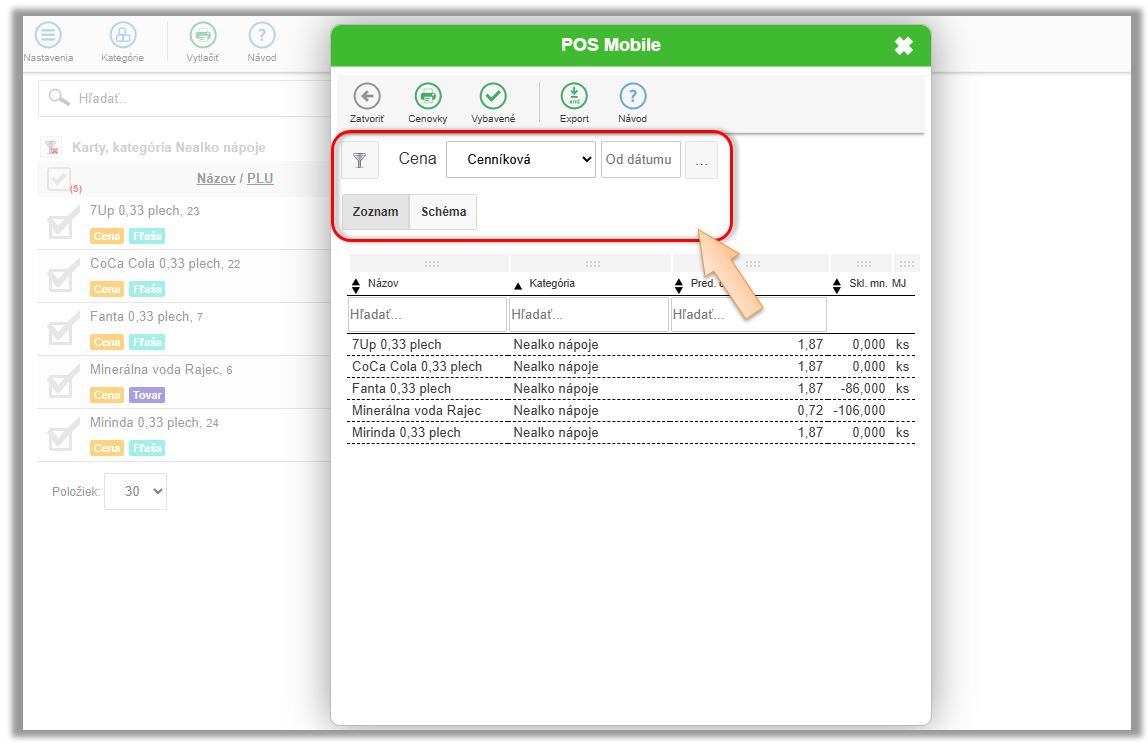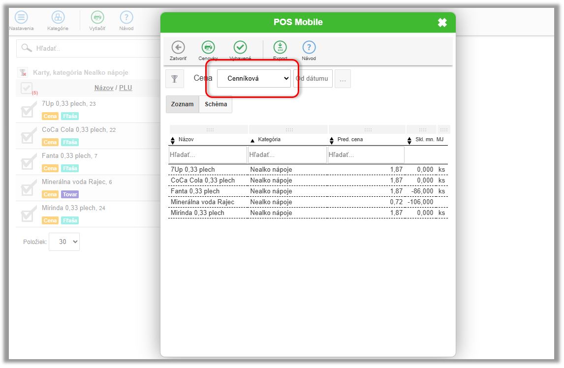 • Nastavte si požadované parametre pre tlač. (Napr. výberom ceny na cenovke Základná/Cenníková/Rozvoz.)