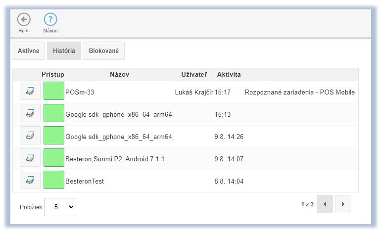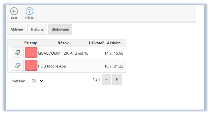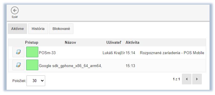 V tomto zozname je možné si zobraziť práve aktívne zariadenia, ktoré pristupujú k aplikácií, alebo zoznam zariadení, ktoré boli zablokované. V zozname je aj zobrazený dátum a čas poslednej aktivyty zariadenia.