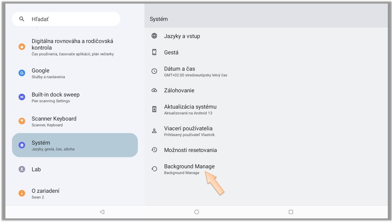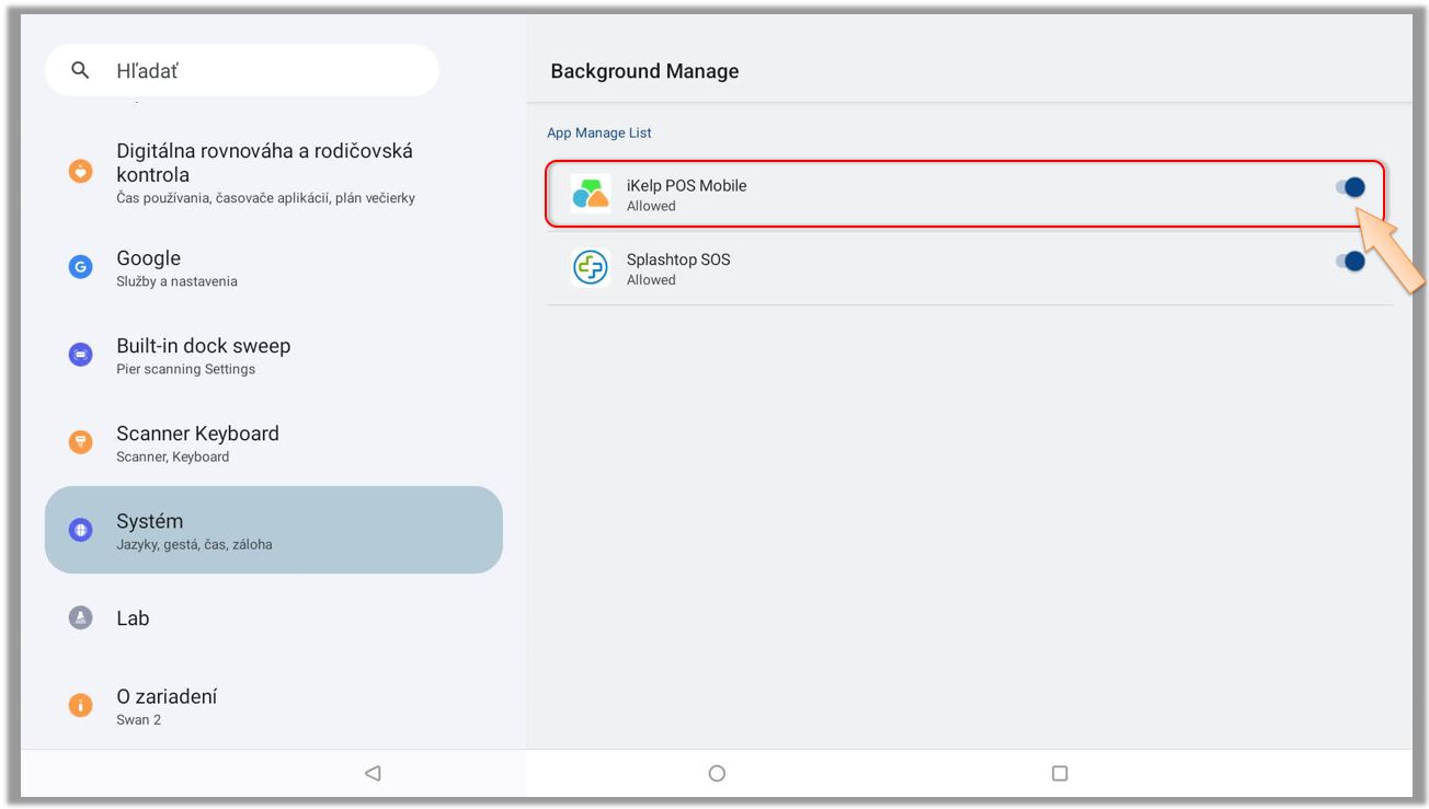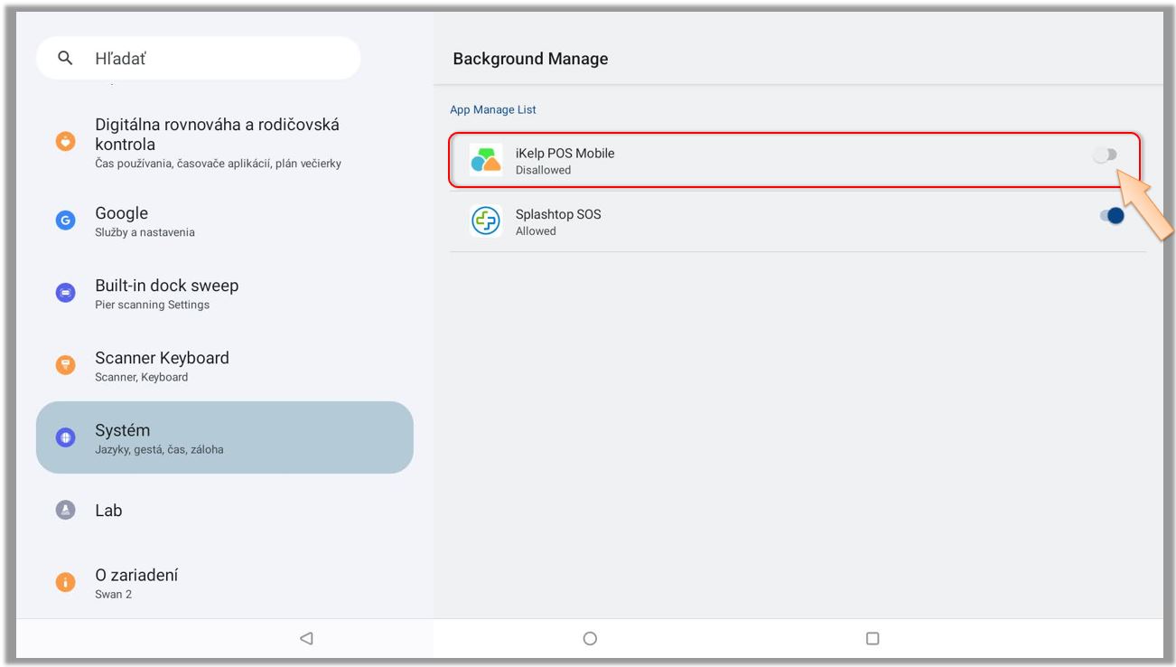 - S hlásením: Spojenie s POS Manažérom bolo prerušené a stav tlačového servera je v stave Zastavený a nie je možné ho spustiť sa môže zobrazovať na zariadeniach SWAN 2, prípadne iných zariadeniach s OS Android v. 13. Ak aplikácia dlhšiu dobu beží, systém ju vyhodnotí ako problémovú a kvôli optimalizácii chodu systému aplikácii vypne prístup k dátovým službám, preto je potrebné túto optimalizáciu vypnúť.