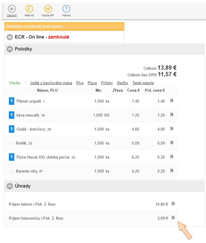 - Kliknite na ikonu platidla pre doplatenie zvyšnej sumy, napr. Príjem hotovosť.