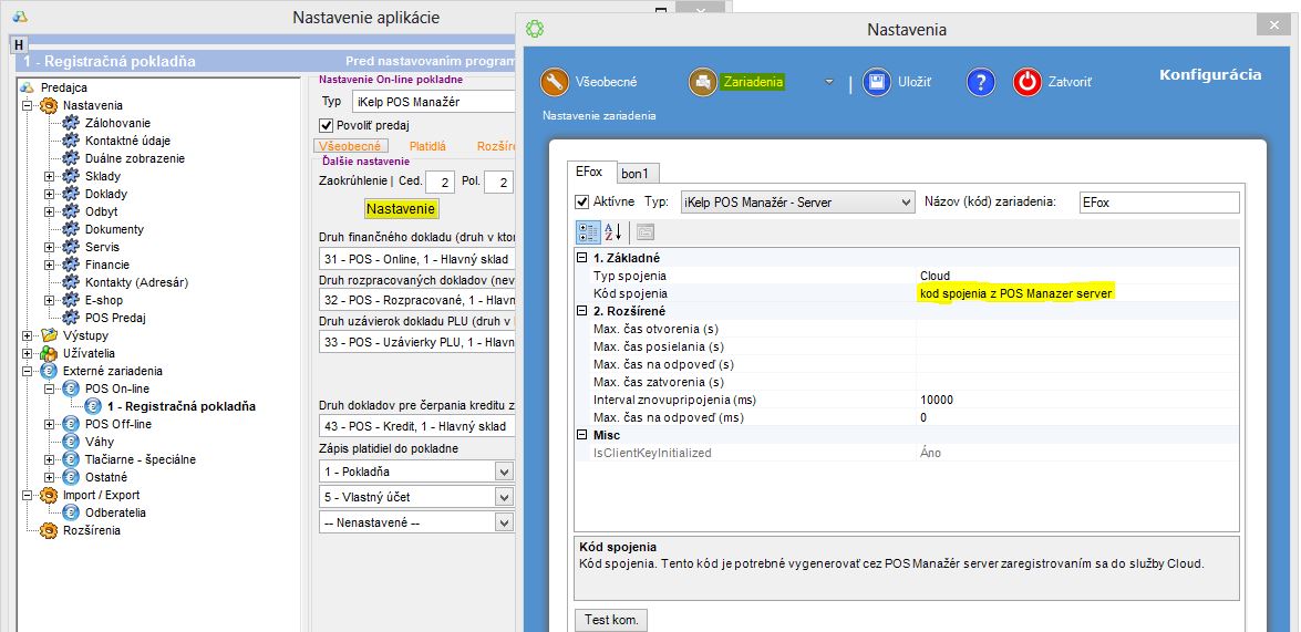 V prípade, že budete realizovať priamo On-line predaj, odporúčame ďalej vykonať nastavenie fiskálnej tlačiarne alebo registračnej pokladnice v aplikácii iKelp POS Manažér. Viac informácií o aplikácii iKelp POS Manažér server sa dočítate v návode Inštalácia aplikácie POS Manažér. (Konfiguráciu fiskálneho zariadenia Vám odporúčame konzultovať s autorizovaným servisným partnerom.) Spustite aplikáciu iKelp Predajca v Cloude a v časti nastavenia POS On-line, kliknutím na tlačidlo Nastavenia v nastaveniach Zariadenia vyberte typ "iKelp POS Manažér - Server", typ spojenia vyberte "Cloud" a "Kód spojenia" doplňte z aplikácie POS Manažér server.