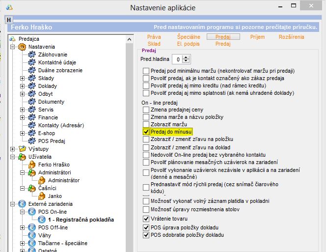 4. V ľavej časti okna, v strome jednotlivých nastavení vyberte možnosť Doklady -> Predaj v zozname nastavení aktivujte nastavenie "Povoliť predaj do záporného stavu. (Platí len pri priemerovaní v sklade.)".