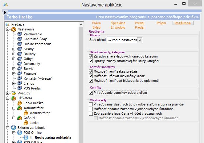 Zmena, resp. úprava týchto nastavení Vám zabezpečí možnosť vytvorenia príjemky resp. povolenie predaja do mínusu ak ešte nemáte tovar naskladnený. Jedná sa však len o vzorový model a základné nastavenia pre to, aby bolo v aplikácii možné okamžite začať pracovať a realizovať predaj. Odporúčame následne nastaviť aj ostatné nastavenia.