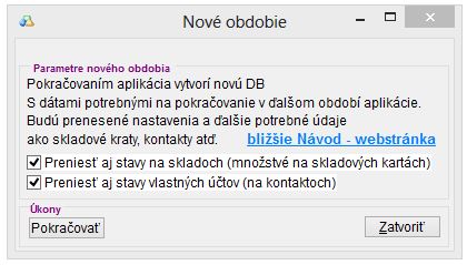 Aplikácia spraví štruktúrovú kópiu databázy a následne prenesie nastavenia z pôvodnej databázy. Do novej databázy sa prenášajú všetky nastavenia tak, aby sa nová databáza dala okamžite používať. Pri vytváraní nového obdobia je ďalej možné si zvoliť, či sa majú prenášať aj množstvá na skladových kartách (na príslušných skladoch sa spraví automaticky inventúrna príjemka alebo výdajka podľa pôvodného množstva). V prípade používania licencie "Vlastné účty", prenášajú sa aj stavy kontaktov.