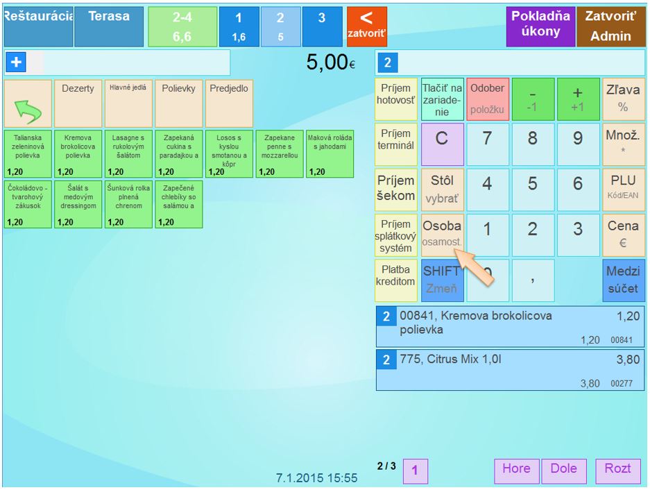 - Kliknutím na tlačidlo "Osoba osamost." vytvoríte na danom stole nový doklad. (Tlačidlo sa na pokladni nachádza nad tlačidlom SHIFT a zobrazí sa po označení danej osoby na lište.)