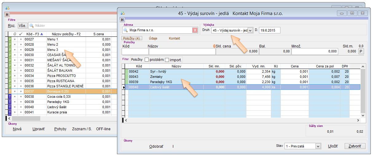 1. Ak z pohľadu kuchyne nie je potrebná detailná evidencia skladu. Karty či už denného menu alebo jednotlivých jedál sú evidované ako karty typu "Práca" a k odpisu surovín zo skladu dochádza ich priamim výdajom. (Predávajú sa jedlá a denné menu, ale odpis surovín zo skladu prebehne skladovou výdajkou.)