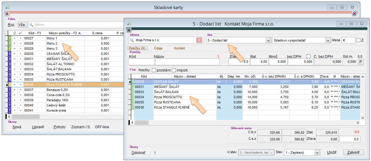 • Vytvorením dodacieho listu s nahodením konkrétnych jedál, podľa počtov predaného denného menu. Týmto sa zabezpečí odpis jedál zo skladu.