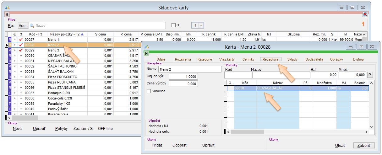 2. Jednotlivé jedlá sú v aplikácii definované ako karty typu "Receptúra", na ktoré sú naviazané jednotlivé suroviny. Denné menu sa ale eviduje na kartách typu "Práca" a len na základe predaných množstiev sa pomocou dodacieho listu odpíšu jednotlivé jedlá zo skladu. Pri vysporiadaní výroby (Uzávierke receptúr) sa odpíšu všetky suroviny zo skladu na základe denného predaja. (Predávajú sa jedlá, ktoré evidujú odpis zo skladu pomocou výroby. Pri predaji denného menu sa eviduje počet predaných kusov, ktorý sa pripočíta pomocou dodacieho listu k predajom jedál. Následne sa vysporiada sklad pomocou výroby.)