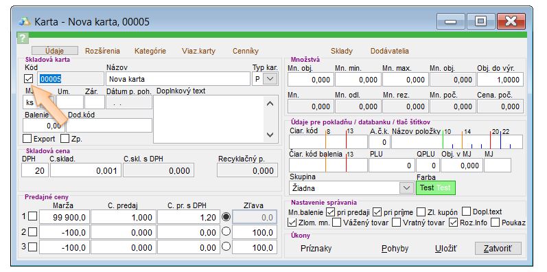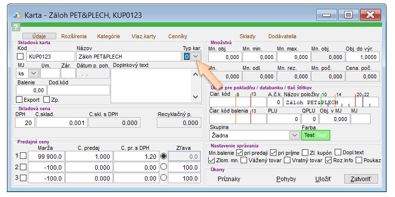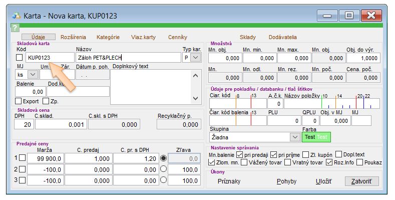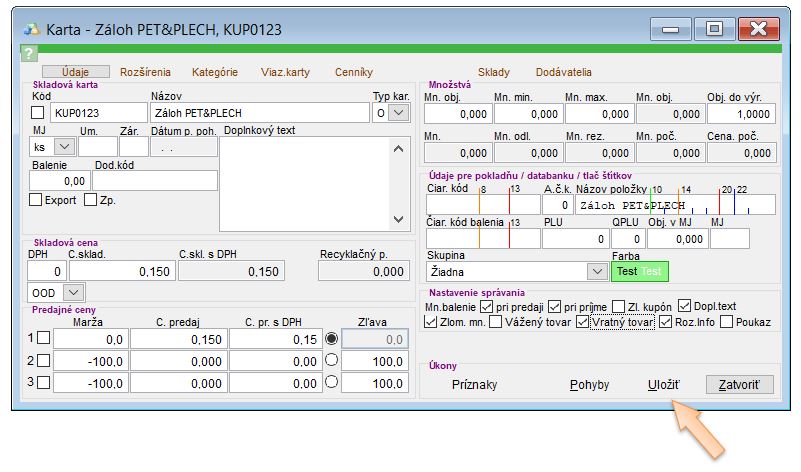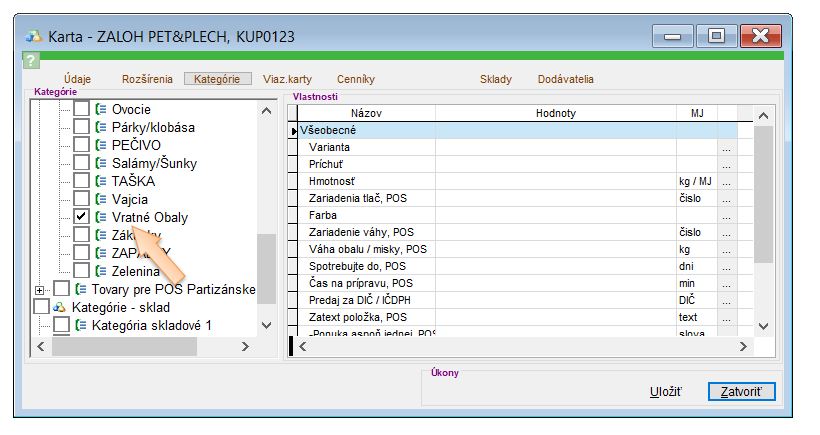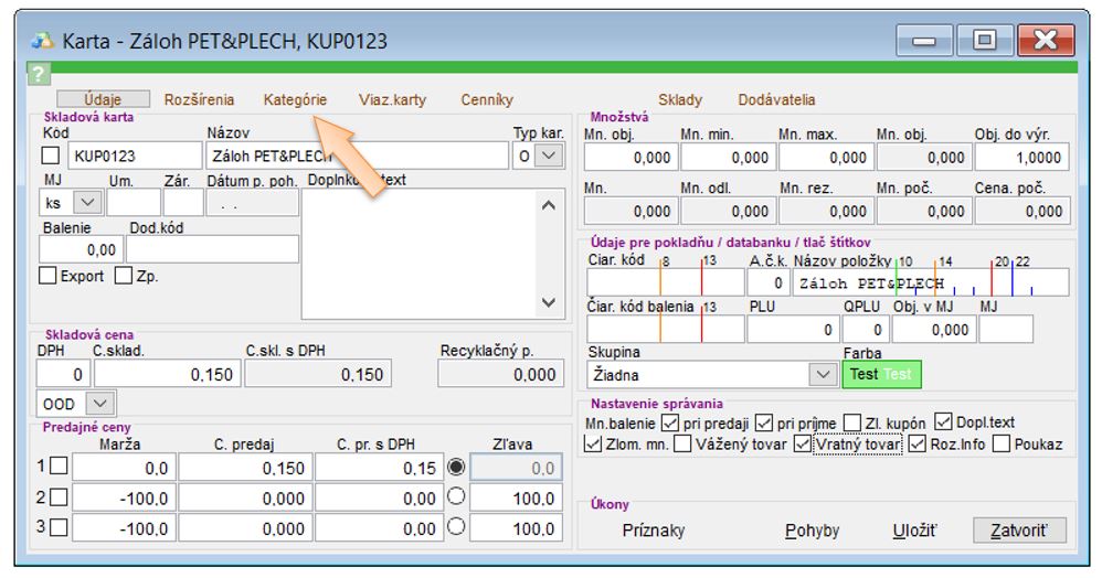 • V záložke Kategórie zaraďte kartu do príslušnej kategórie pre zobrazovanie v predaji. (Napr. kategória Obaly.)