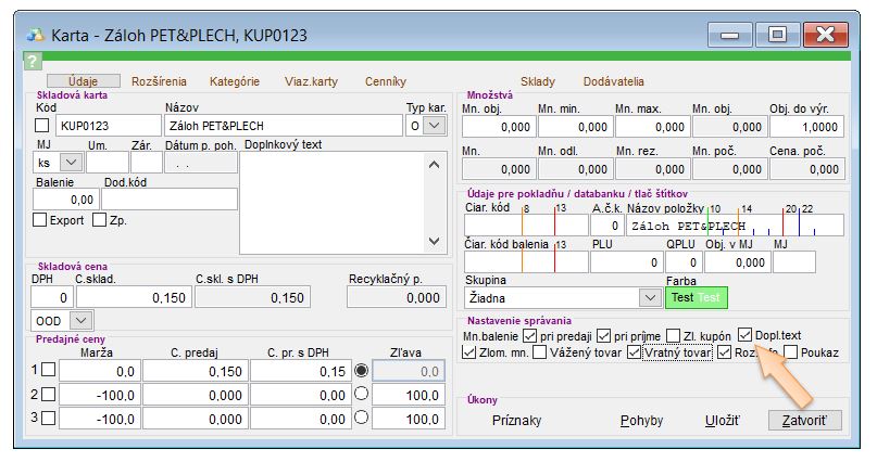 • Aktivujte príznak Dopl. text. (Po zadaní danej karty obsluhou bude systém požadovať zadanie kupónu. Pri osnímaní skenerom, sa tento natiahne do systému automaticky.)