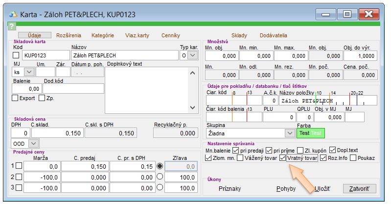 Pre štatistickú evidenciu aplikovaných kupónov a vykúpených obalov, odporúčame mať pre výkup vytvorenú nezávislú skladovú kartu, ktorá nebude mať väzby na predajný tovar. To znamená, ak predávate napr. Coca - Colu v plechovke, a pri predaji Coca - Coly sa má automaticky naúčtovať aj záloh za plechovku, je potrebné mať pre túto väzbu vytvorenú nezávislú kartu, napr. "Záloh PLECH", ktorá bude na položke Coca - Cola nastavená ako viazaná karta. V prípade obalov (napr. sklo), ktoré nepodliehajú tejto štatistickej evidencii môžete mať jednu kartu, ktorá bude aj ako viazaný tovar (napr. k pivu) a rovnako bude slúžiť s príznakom vratný tovar aj pre výkup.