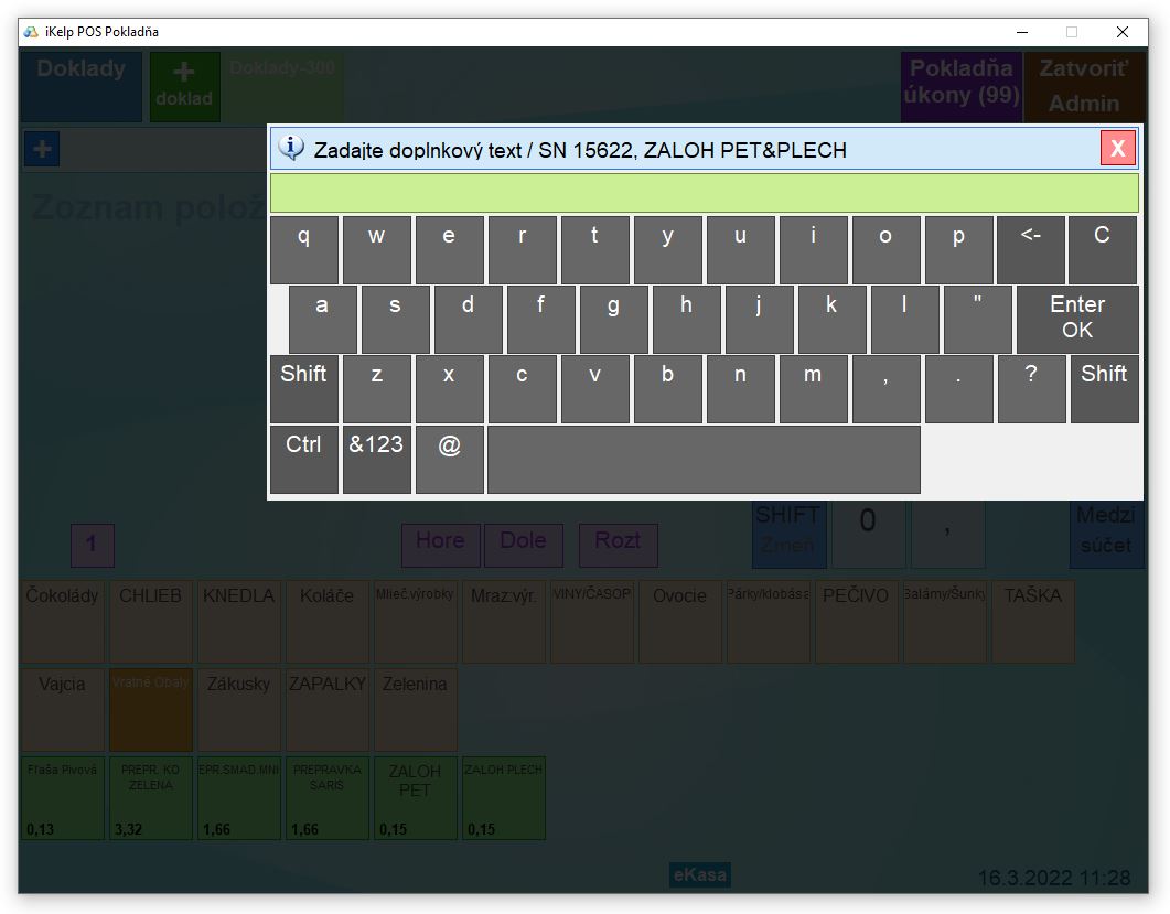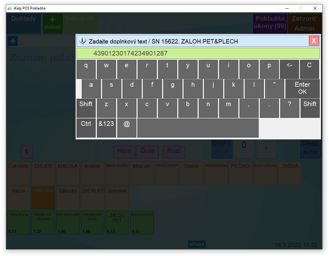 • Po výbere položky "Záloh PET&PLECH" zadajte doplnkový text, to znamená kód z etikety etiketovacieho stroja.