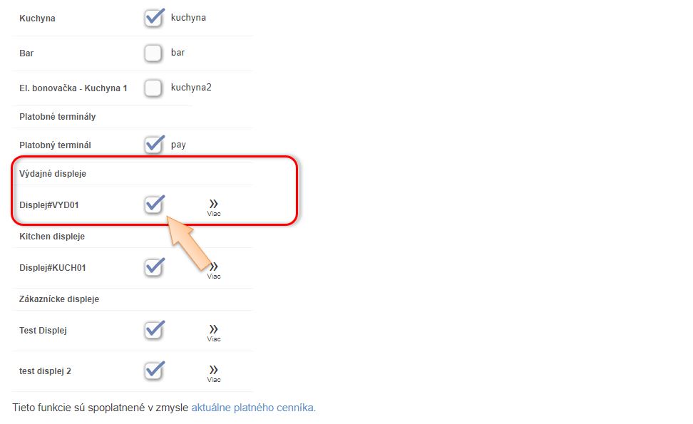 - V prípade kombinácie Zákaznícky a Kuchynský displej musí byť nadefinované a aktívne aj toto zariadenie.