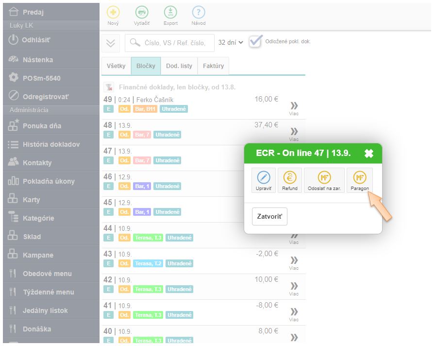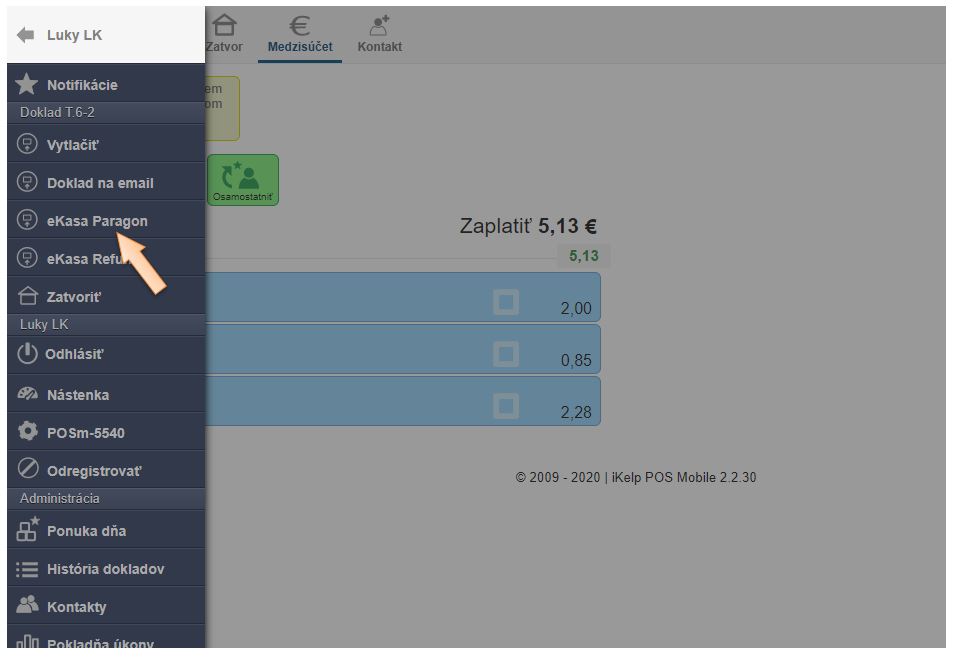 4. Kliknite na ikonu menu a vyberte možnosť eKasa Paragon.