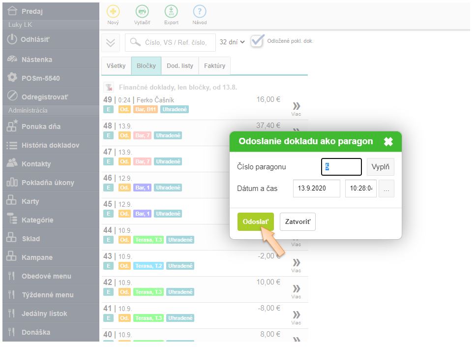 Doklad je na portál finančnej správy nahlasovaný ku dňu a času, kedy doklad vznikol v systéme. Preto aj dátum a čas sú automaticky nastavené podľa toho kedy doklad vznikol a rovnako tak doklad vstupuje do rozborov a štatistík do tohto dňa. Ak sa teda doklady nahlasujú dodatočne, napr. o deň neskôr, v aplikácii tieto doklady nevstupujú do rozborov ani uzávierky ku dňu kedy boli nahlasované ale kedy boli reálne v aplikácii vytvorené.