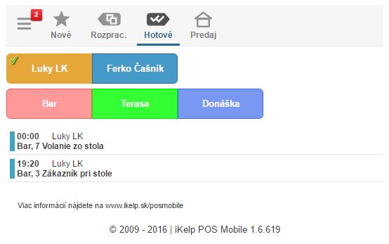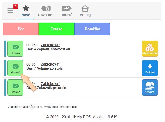 • Zoznam aktívnych notifikácií je možné filtrovať na jednotlivé miestnosti, kliknutím na ikonu je možné zmeniť ich stav na Rozpracované alebo Hotové. V príslušnej záložke je potom možné zobraziť rozpracované, alebo hotové notifikácie. Akonáhle je doklad ukončený, notifikácie sú zo systému odstránené.