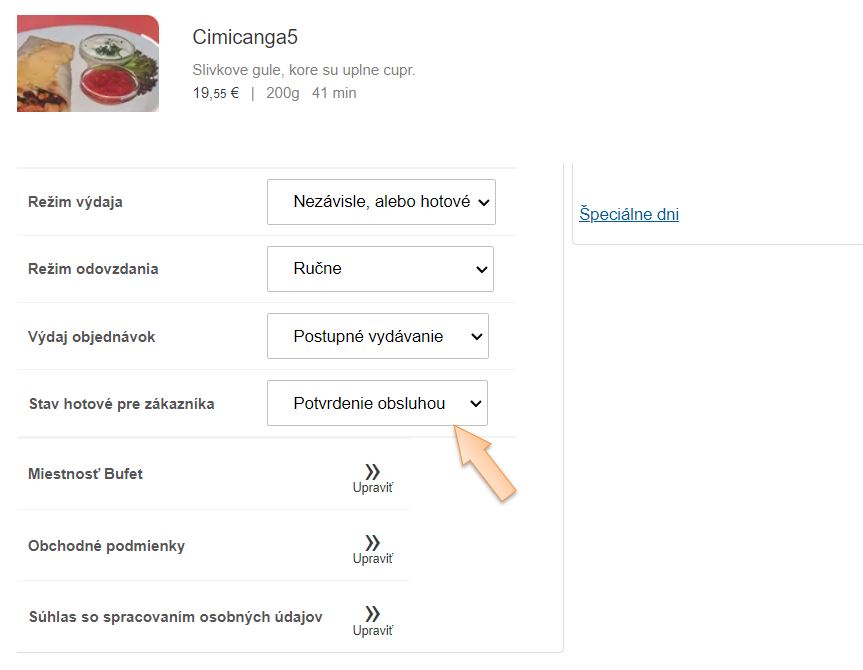 • Stav hotové pre zákazníkastav, kedy je zákazník notifikovaný o tom, že jeho objednávka je pripravená. Stav vie nastaviť kuchyňa zmenou stavu objednávky na Hotovo, alebo obsluha zadefinovaním stavu Pripravené na výdaj.