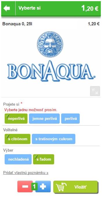 1. Prajete si - pri vyplnení vlastnosti Prajete si, je následne potrebné pri výbere danej položky do predaja vybrať niektorú z uvedených možností. Vždy musí byť vybraná aspoň jedna. (Napr. "neperlivá", "jemne perlivá", "perlivá". Ak pri výbere nie je zvolená žiadna, aplikácia na to upozorní varovným hlásením.)