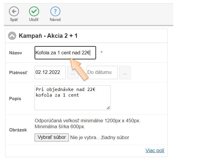 - Kliknutím na Viac polí je možné definovať rozšírené pravidlá kampane, ako uplatnenie, použitie alebo zadefinovať platnosť napr. konkrétny deň alebo hodinu.